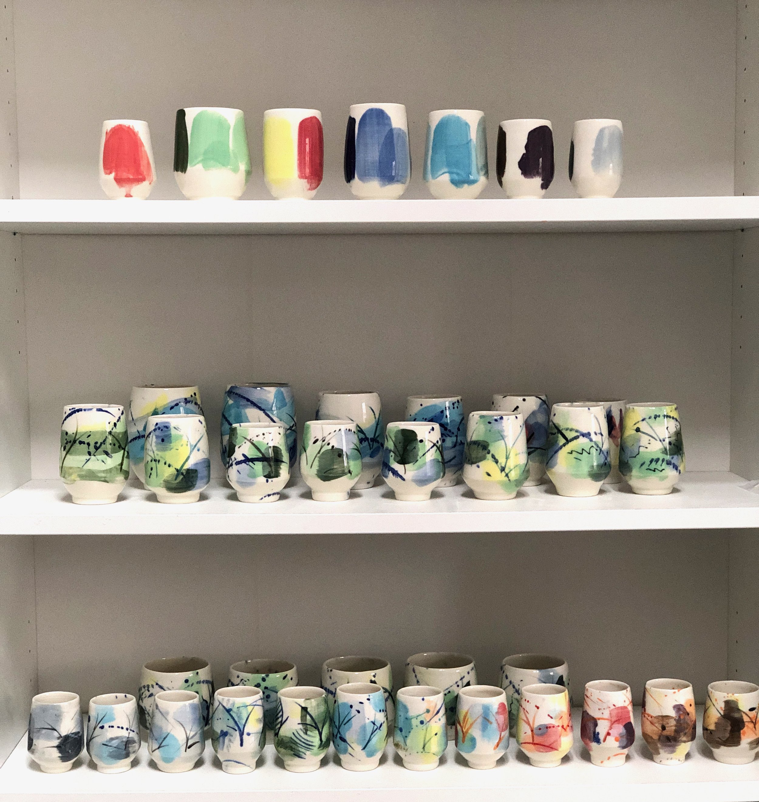 I make functional pots, using porcelain clay. These are thrown on the wheel, and decorated with coloured slips and underglazes.